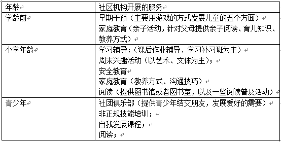 在满足流动儿童全面发展的各种需求中,社区机构能够扮演什么角色?谈了从儿童的需求,到流动儿童的需求。但只有需求还不足以确定社区机构提供什么样的教育服务。原因是需求多种多样,社区机构不可能什么需求都去满足,社区机构还需要从众多需求中去选择。所以我们需要第二个角度——“社区机构自身”去考虑。在满足流动儿童全面发展的各种需求中,社区机构能够扮演什么角色?