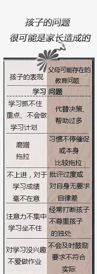 孩子的缺点和问题,往往由多种原因造成,这些影响因素中,一定有家长的教育方式,下面这个问题对照表不一定绝对,不能完全对号入座,但至少可以代表一部分家长存在的问题哦,尝试自查一下吧。