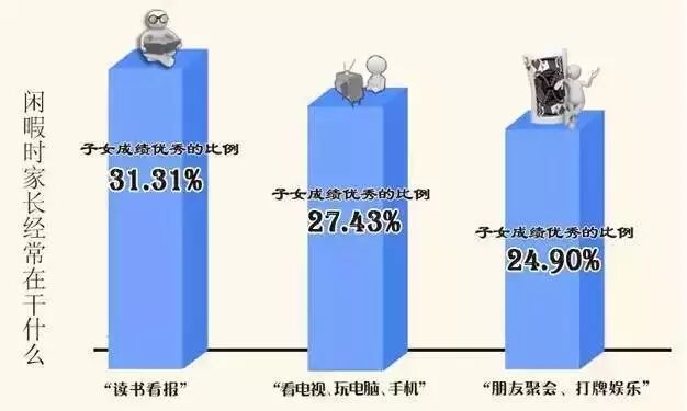 调查数据显示,闲暇时父母经常读书看报的家庭子女成绩优秀的比例更高;爸爸经常和孩子做事(玩智力游戏、打闹玩耍、一起运动、一起聊天谈心、一起尝试新事物、一起修理东西、共同保守一个秘密)对孩子的学业水平影响明显;家庭娱乐活动越多孩子成绩越优秀;而成绩优秀的学生家庭“几乎每天”或者“每周2-3次”能家人共进晚餐。