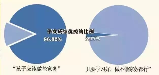认为“只要学习好,做不做家务都行”的家庭中,子女成绩优秀的比例仅为3.17%,而认为“孩子应该做些家务”的家庭中,子女成绩优秀的比例为86.92%,两者相差悬殊。