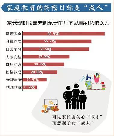调查结果显示,很多家长只关心孩子的健康安全、学习成绩等现实性因素,对兴趣爱好、性格养成等发展性因素的关注度较低。从高到低依次为:
