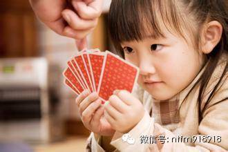 可锻炼注意力高度集中和快速反应能力。取三张不同的牌(去掉花牌),随意排列于桌上,如从左到右依次是梅花2,黑桃3,方块5、选取一张要记住的牌,如梅花2,让她盯住这张牌,然后把三张牌倒扣在桌上,由家长随意更换三张牌的位置,然后,让她报出梅花2在哪儿。如她说猜对了,就胜,两人轮换做游戏。随着能力的提高,家长可以增加难度,如增加牌的数量,变换牌的位置的次数和提高变换牌
