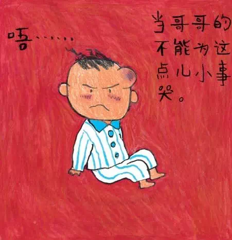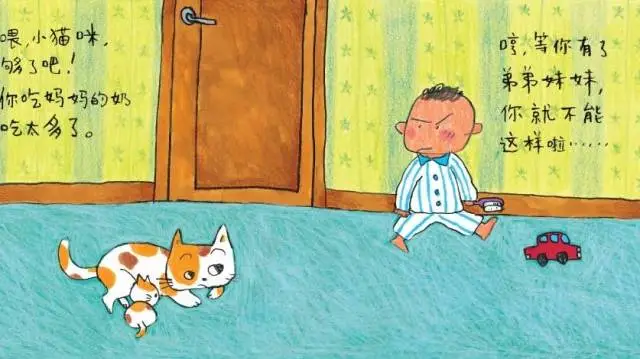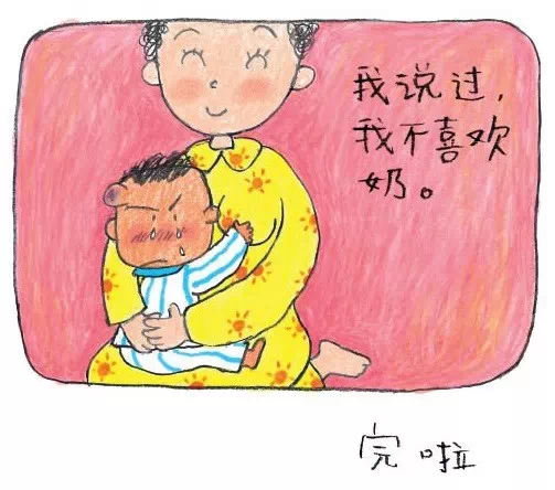 所以,当书中的小哥哥的头被撞到,寻求妈妈的安抚时,就觉得妈妈的奶又香又暖和……积蓄多时的对妈妈的爱被弟弟分享的担心,一下子爆发了,这个才是这个小男孩儿“最讨厌奶”的导火索吧。