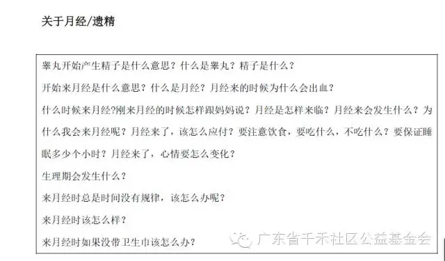 以上部分小朋友匿名问题的图片截取于《异路童行小组学习成果汇报》 能够让儿童能接收到正面的性教育知识;希望能够形成一套专门服务儿童性教育的模式并推广到更多人群中去;能够让中国家庭的性教育知识水平有一个质跨越——这些“能够”都是异路童行小组对《成果汇报册》在儿童性教育的影响力上的最大期盼 。