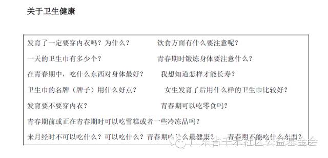 该问卷内容涉及获取青春期知识途径,对生理和心理变化、人际交往、卫生健康疾病的了解,对青春期卫生健康教育方式、态度、内容的意愿。
