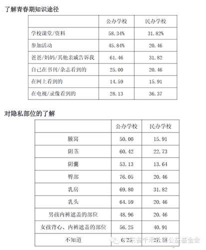 异路童行小组将其服务对象定位于流动儿童,为此小组成员韦月美在其项目点针对公办学校和民办学校的学生设计了关于青春期的调查问卷并对其所得数据进行分析。