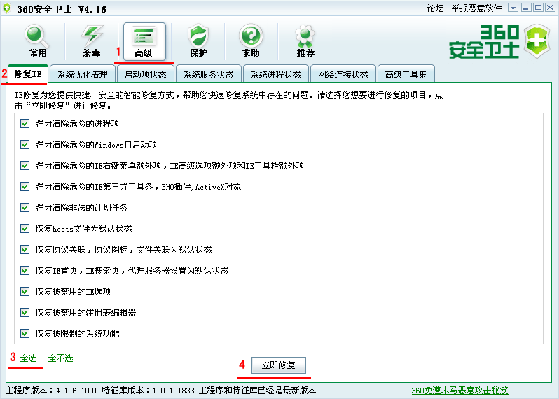 三、高级 / 修复IE ( 按图中序号操作即可 )