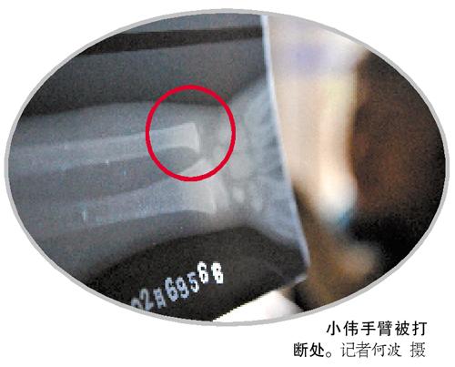 当天回家后,家人发现小伟闷闷不乐遂询问,小伟默不作声。“第二天,孩子就开始喊手腕痛,到后来,手腕上方红肿得像个小馒头。”父亲李先生说,2月28日,小伟才承认被老师打了,怕被责骂,没敢跟家长说。”